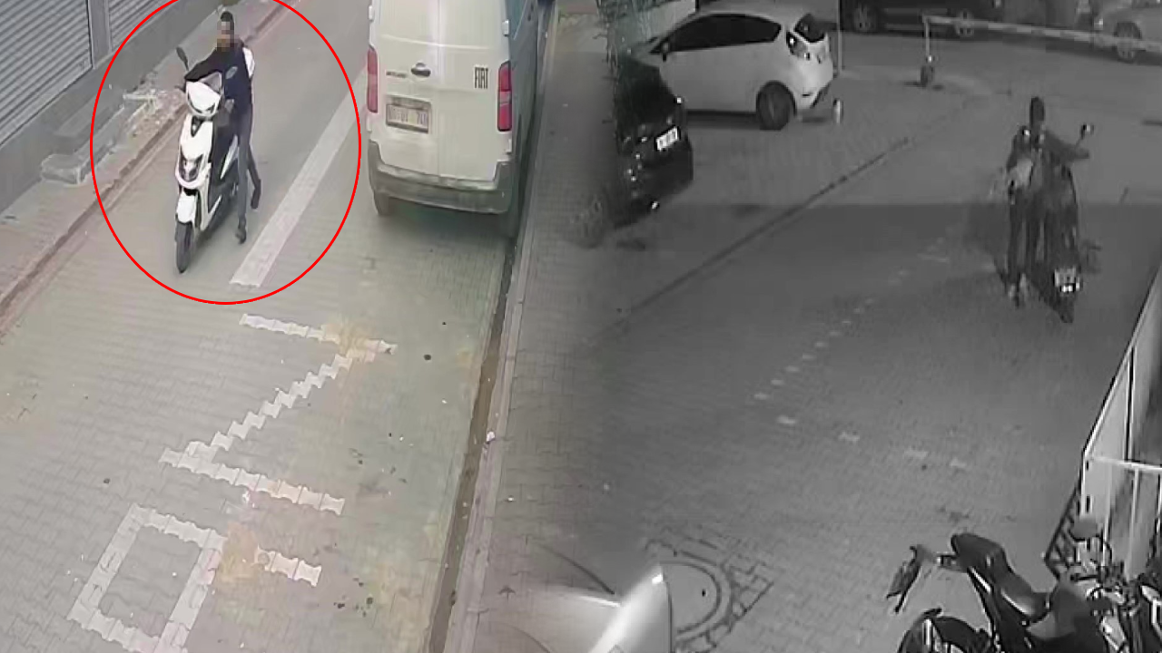 M.K. (26) sokakta gezdiği sırada bir apartmanın bahçesine girip buradaki motosikletin gidon kilidini kırıp sürükleyerek götürdü. Hırsızlık anları güvenlik kamerasına anbean yansıdı.