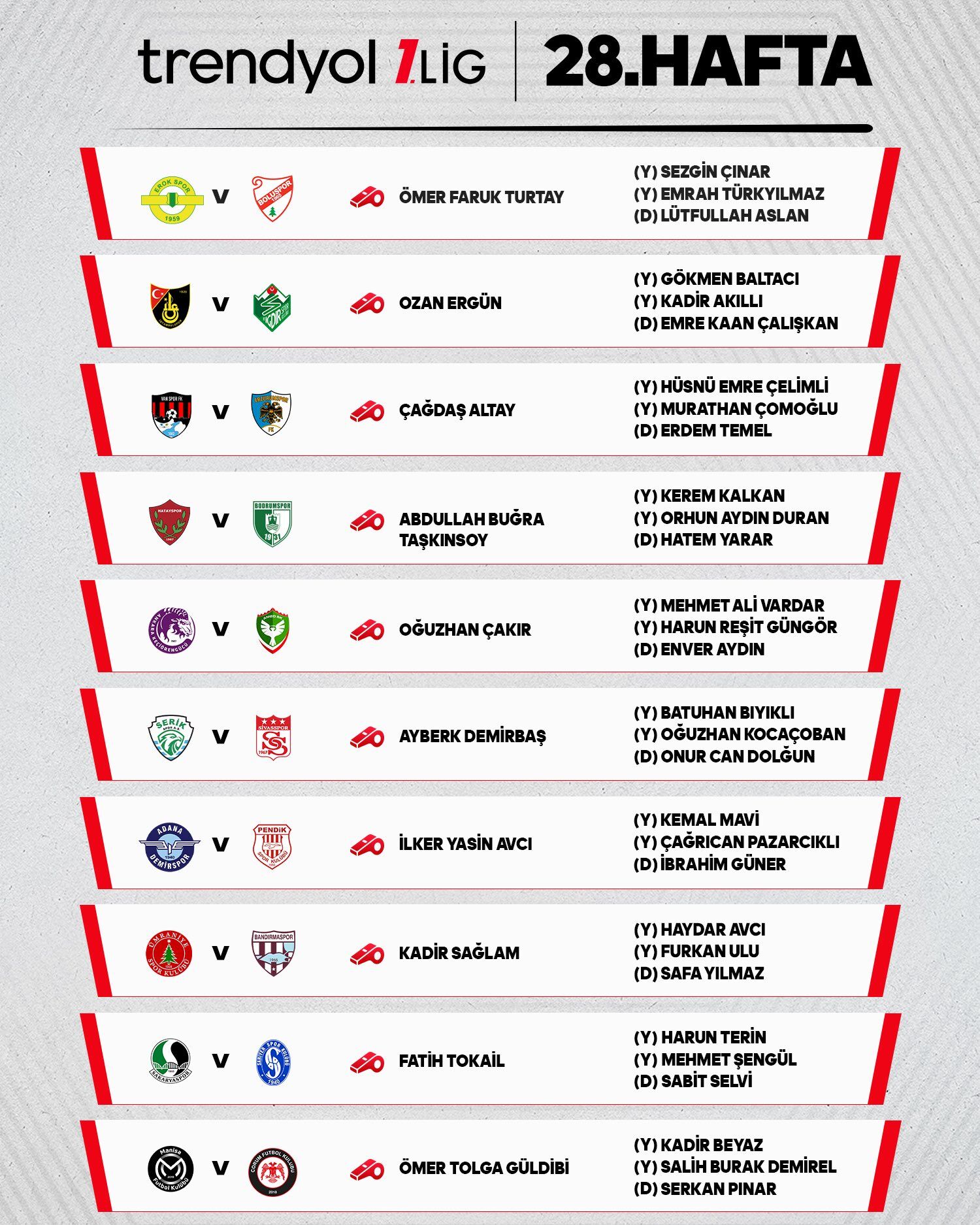 MHK'den yapılan açıklamaya göre, lider Erzurum'un maçında Çağdaş Altay görev yapacak. Liderin en yakın takipçisi Esenler Erok'un, Boluspor'u ağırlayacağı maçını Ömer Faruk Turtay yönetecek.