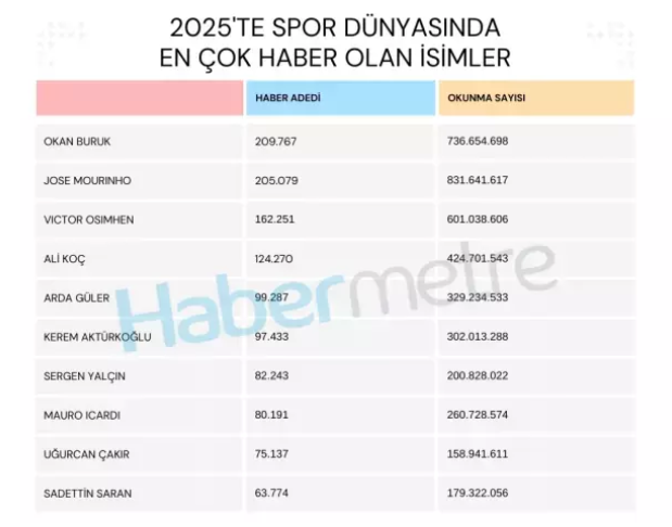 Listenin zirvesinde Galatasaray Teknik Direktörü Okan Buruk yer aldı. Sarı Kırmızılılarla üst üste 3 sezon şampiyonluk yaşayarak kulübe 5. yıldızı kazandıran Buruk, 2025 yılında 209 bin 767 habere konu olurken, bu haberler toplamda 736 milyon 654 bin 698 okunmaya ulaştı.