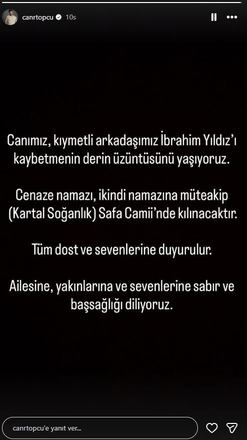 Genç yaşta hayata veda eden Yıldız’ın ölüm haberi, sevenlerini ve meslektaşlarını yasa boğdu. Oyuncunun vefatını, birlikte projelerde yer aldığı meslektaşı Caner Topçu sosyal medya hesabından yaptığı paylaşımla duyurdu.