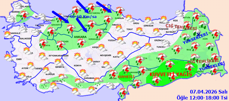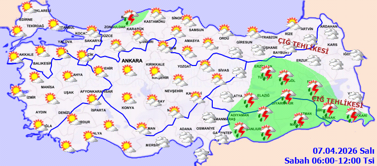 Meteoroloji, özellikle öğle saatlerinden itibaren iki bölgeye dikkat çekti. Yağışların; Güneydoğu Anadolu'nun doğusu (Diyarbakır, Şanlıurfa, Siirt) ile Osmaniye çevrelerinde yer yer kuvvetli olması bekleniyor. Vatandaşların ani sel, su baskını ve yıldırıma karşı tedbirli olmaları istendi.