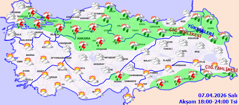 - İstanbul: Parçalı ve çok bulutlu; akşam ve gece saatlerinde sağanak ve gök gürültülü sağanak yağışlı. (16°C)