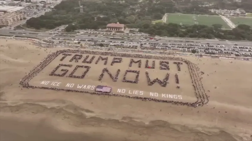Körfez Bölgesi'nde planlanan en az 60 etkinlikten biri olan bu organizasyonda, binlerce kişi kumsalda bir araya gelerek devasa bir insan zinciri oluşturdu. Havadan çekilen görüntülerde net bir şekilde okunan bu insani pankartta; "Trump Must Go (Trump Gitmeli)", "No Kings (Kral Yok)", "No War (Savaşa Hayır)" ve "No Lies (Yalanlara Hayır)" ifadeleri yer aldı.