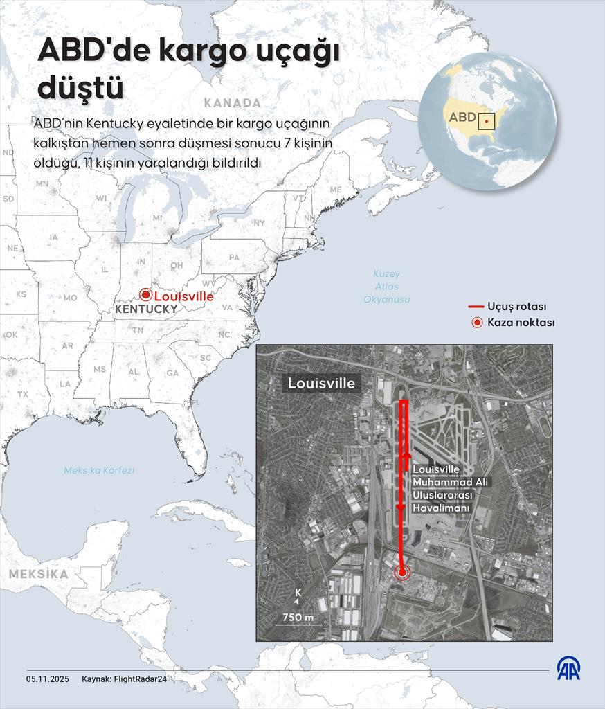 Kentucky Valisi Andy Beshear, Louisville kentindeki Muhammad Ali Uluslararası Havalimanı’nda UPS kargo şirketine ait bir uçağın kalkıştan kısa bir süre sonra düşmesi sonucu ölü ve yaralılar olduğunu açıkladı. İlk belirlemelere göre kazada 3 kişi yaşamını yitirmiş, 11 kişi de yaralanmıştı; Valinin son açıklamasına göre ölü sayısı en az 7’ye yükseldi ve bu sayının artması bekleniyor.