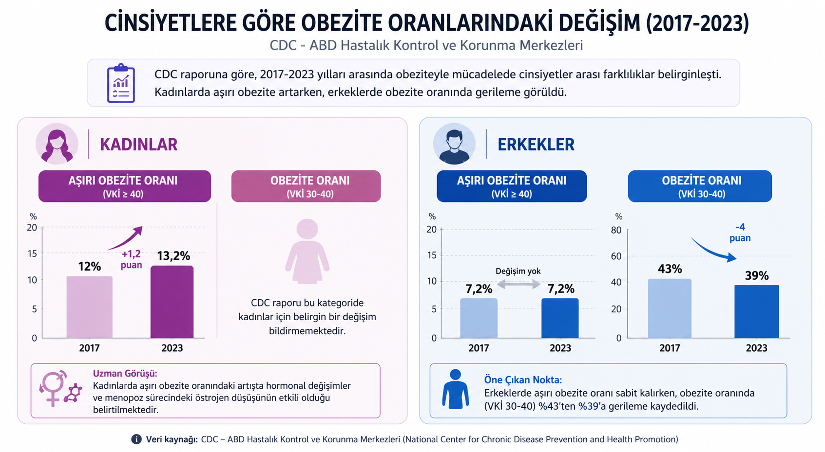 Kadınlar: Aşırı obezite oranı yüzde 12’den yüzde 13,2’ye çıktı. Uzmanlar bu artışta hormonal değişimlerin ve menopoz sürecindeki östrojen düşüşünün etkili olduğunu belirtiyor.
