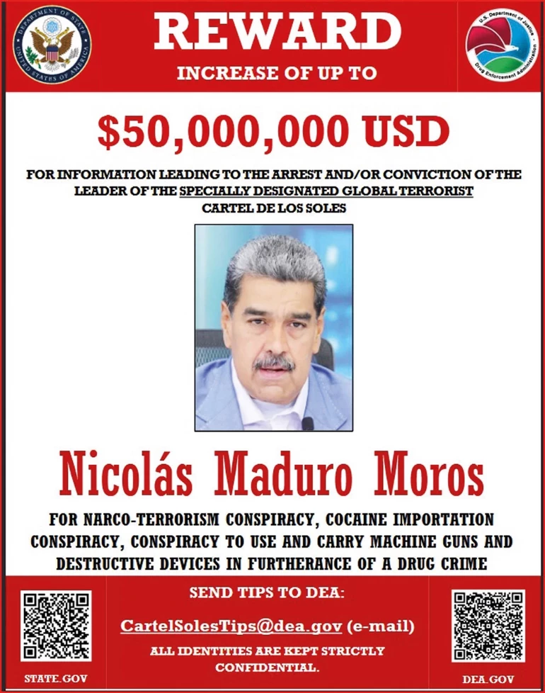 ABD yönetimi, Maduro’yu uyuşturucu kaçakçılığı ve terör örgütü bağlantılarıyla suçluyor. Washington, Maduro’nun “Cartel de los Soles’ın başında olduğunu” iddia ediyor. Bu kapsamda Maduro’nun yakalanmasına yardımcı olacak bilgi için 50 milyon dolarlık ödül konuldu.