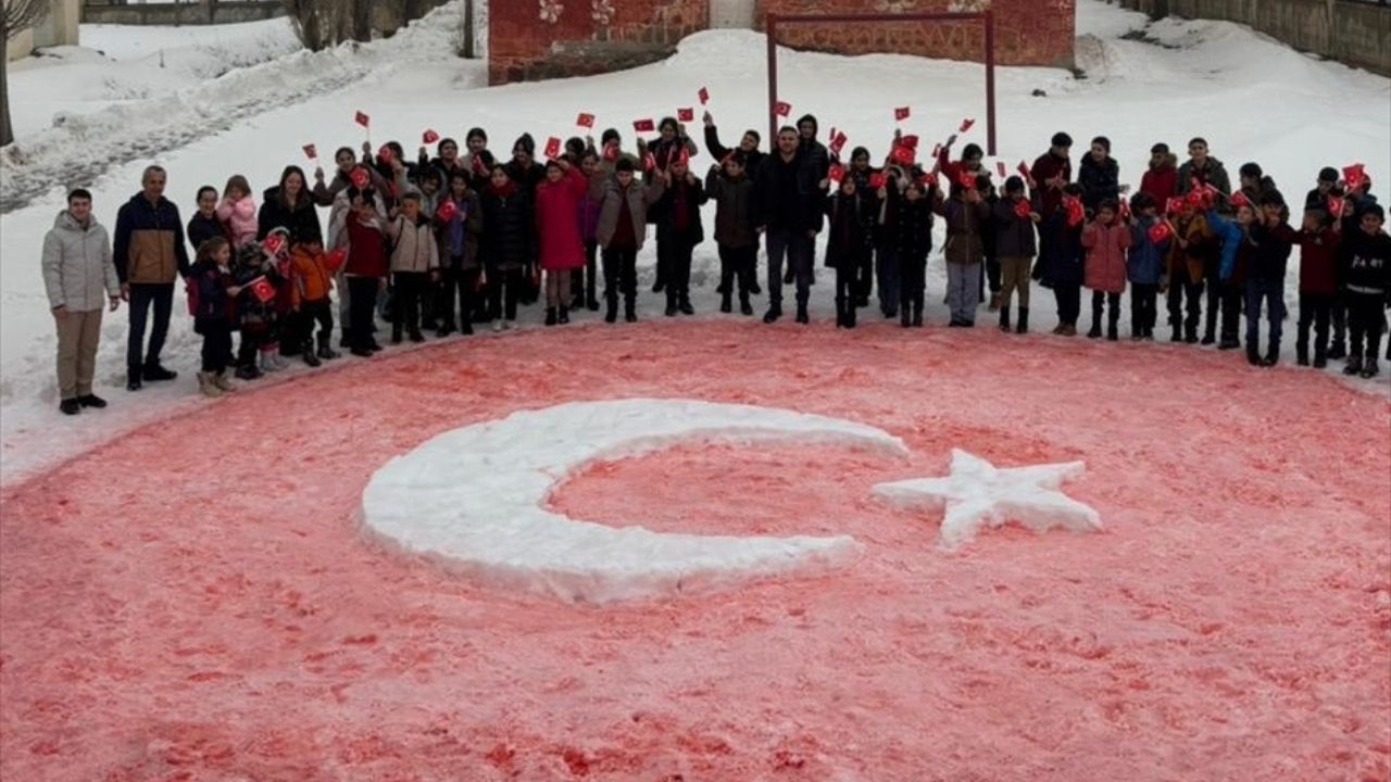 Öğretmenlerin rehberliğinde gıda boyalarıyla renklendirilen kar zemini, kısa sürede ay-yıldızlı Türk bayrağına dönüştü. Karla kaplı bahçede ortaya çıkan bayrak, hem öğrenciler hem de izleyenler için görsel bir şölen sundu.