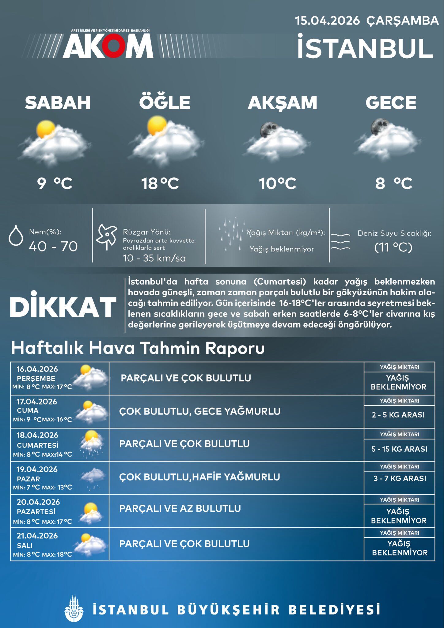 15 Nisan Çarşamba günü itibarıyla İstanbul’da günün en yüksek sıcaklığı 18 derece olarak ölçülürken, gece saatlerinde bu değerin 8 dereceye kadar gerileyeceği tahmin ediliyor. Nem oranının yüzde 40 ile 70 arasında değiştiği kentte, poyrazdan esen rüzgârın saatte 35 kilometre hıza ulaşması hissedilen soğuğu daha da artırıyor. AKOM’un paylaştığı "Dikkat" notunda, gece ve sabah saatlerindeki 6-8 derecelik değerlerin kış koşullarını aratmayacağı vurgulandı.