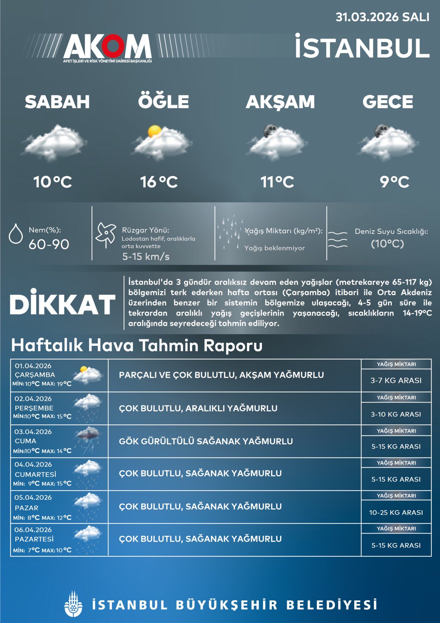 | 6 Nisan Pazartesi | Çok bulutlu, sağanak yağmurlu | 5-15 kg/m² |