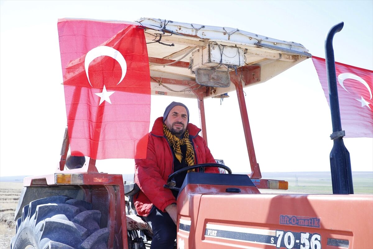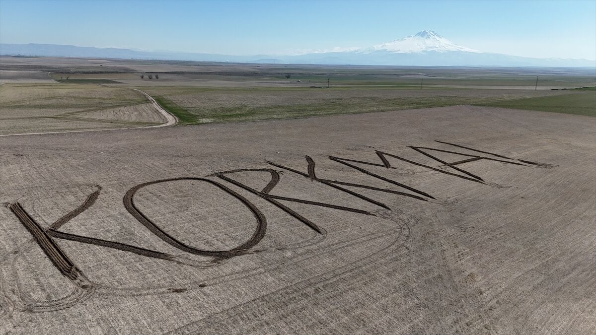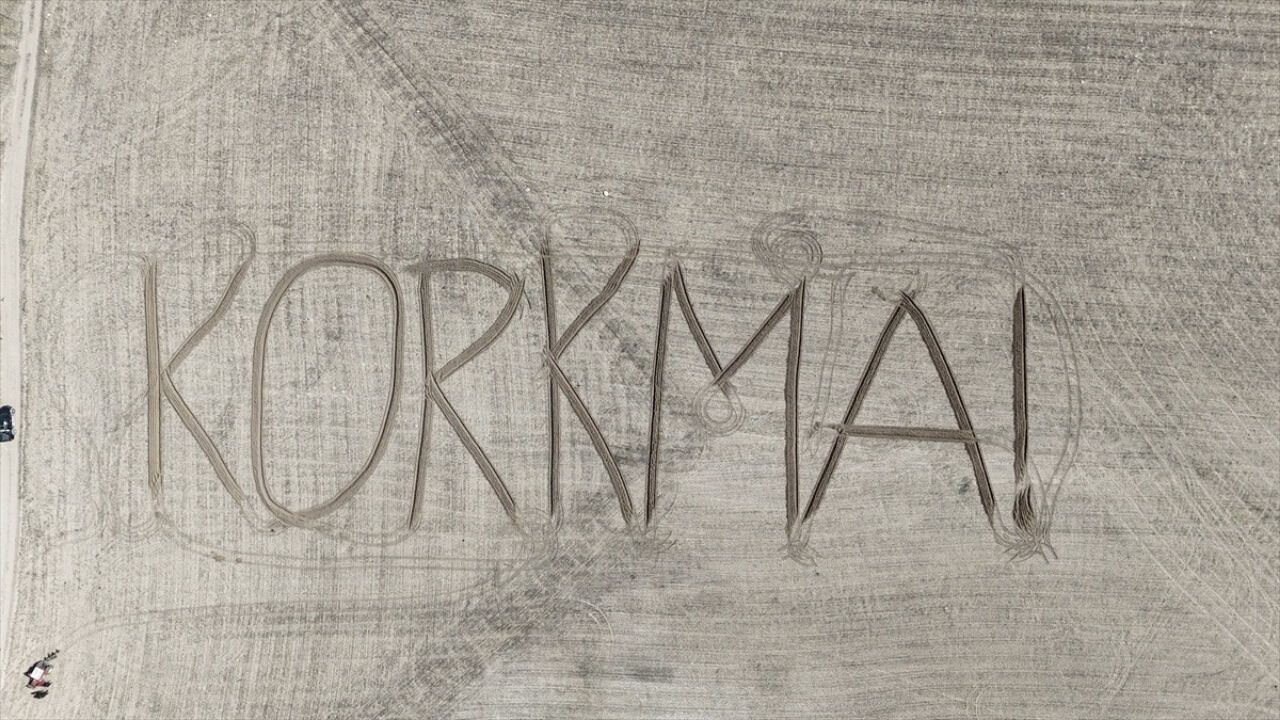 Filikçi, 20 dekarlık tarlasına traktörün pulluğuyla toprakta iz bırakarak "Korkma" yazdı. Çiftçinin yazdığı "Korkma" yazısı dronla görüntülendi.