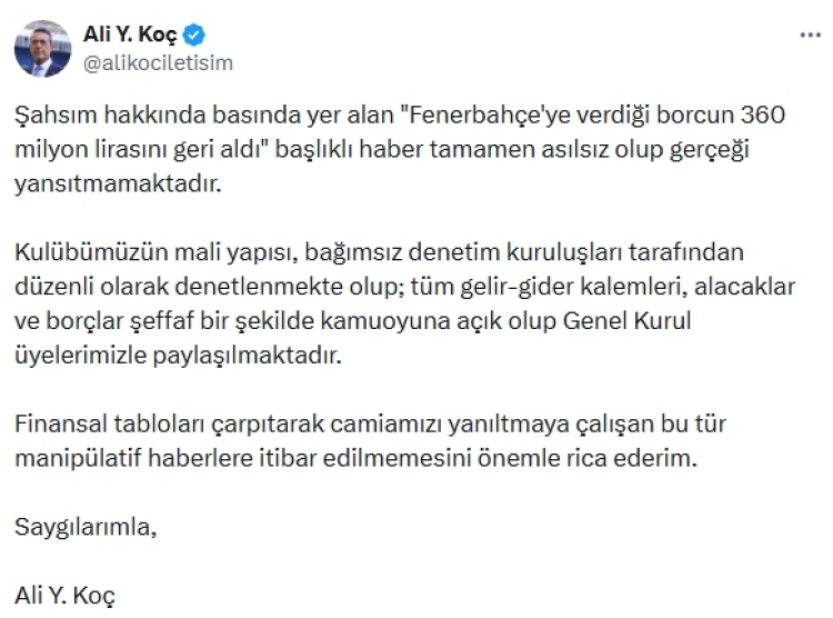 Açıklamasında taraftarlara da çağrı yapan Koç, “Finansal tabloları çarpıtarak camiamızı yanıltmaya çalışan bu tür manipülatif haberlere itibar edilmemesini önemle rica ederim” sözleriyle noktayı koydu.