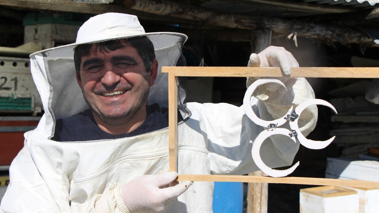Amasya'da eşi ve oğluyla birlikte 3 yıl önce arıcılık kursunda aldığı eğitim sonrası Yazı Bağları Mahallesi'ndeki evinin bahçesine kovanlar yerleştiren Hüseyin Çalışkan, hobi olarak arı yetiştirmeye başladı. İçinde binlerce arının bulunduğu kovanlarının sayısı 35'e ulaşan evli ve 2 çocuk babası Çalışkan, en kaliteli balı yetiştirmeye çabalarken bir kovandaki petek çıtalarına da şekil vermeyi planladı. Siyasetteki rekabeti kovana da taşımak isteyen Çalışkan, AK Parti'nin ampul, CHP'nin altı ok ve MHP'nin üç hilal amblemiyle 3 çıtayı şekillendirdi.