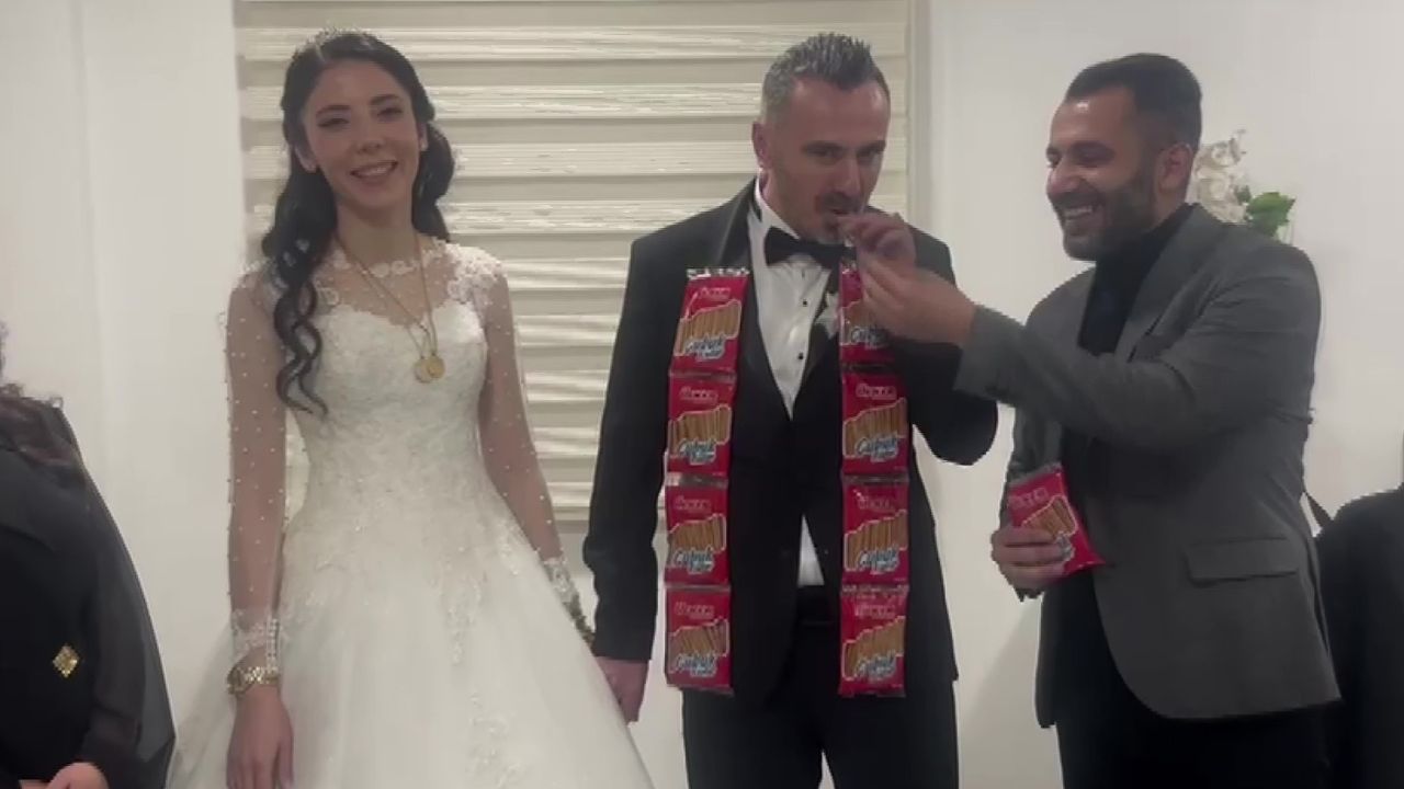 Amasya'da Emre ile Zeynep Aslan çiftinin düğününde damada arkadaşları şaka amaçlı bir kutu çubuk kraker verdi. Damat boynuna asılan hediyeleri şok içinde karşılaşırken, konuklar kahkahalara boğuldu.