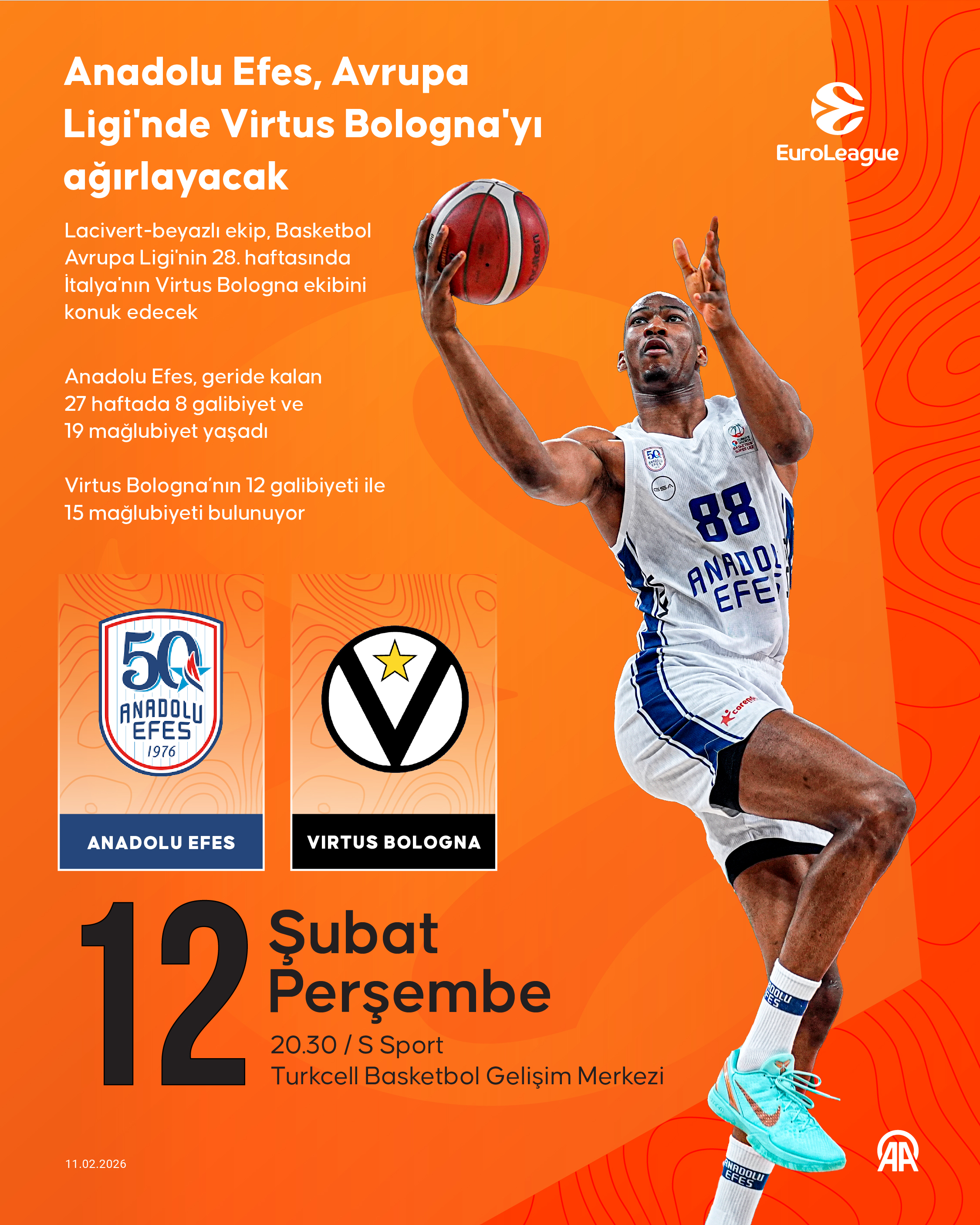 Ligde geride kalan 27 haftada 8 galibiyet ve 19 mağlubiyetle 19. sırada yer alan lacivert-beyazlı ekip, İtalyan rakibini devirerek galibiyet serisini 3 maça çıkarmayı ve alt sıralardan kurtulmak adına önemli bir adım atmayı hedefliyor. Konuk ekip Virtus Bologna ise 12 galibiyet ve 15 mağlubiyetle puan tablosunun 13. basamağında bulunuyor.