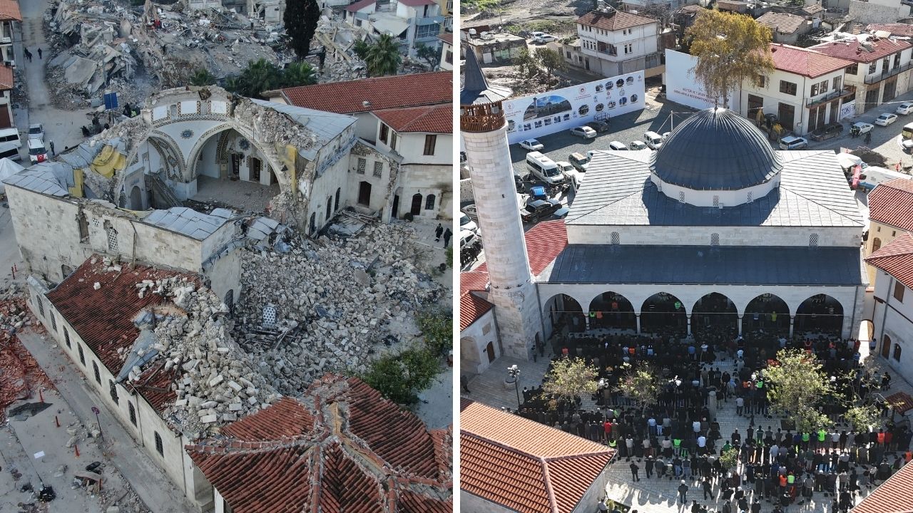 Hatay'da asrın felaketinde yerle bir olan ve Anadolu'daki ilk cami olma özelliğini taşıyan Habibi Neccar Camii, ihya ve inşa süreciyle birlikte yeniden hayat buldu. Depremin ardından camide yaşanan 3 yıllık değişimse havadan görüntülendi.