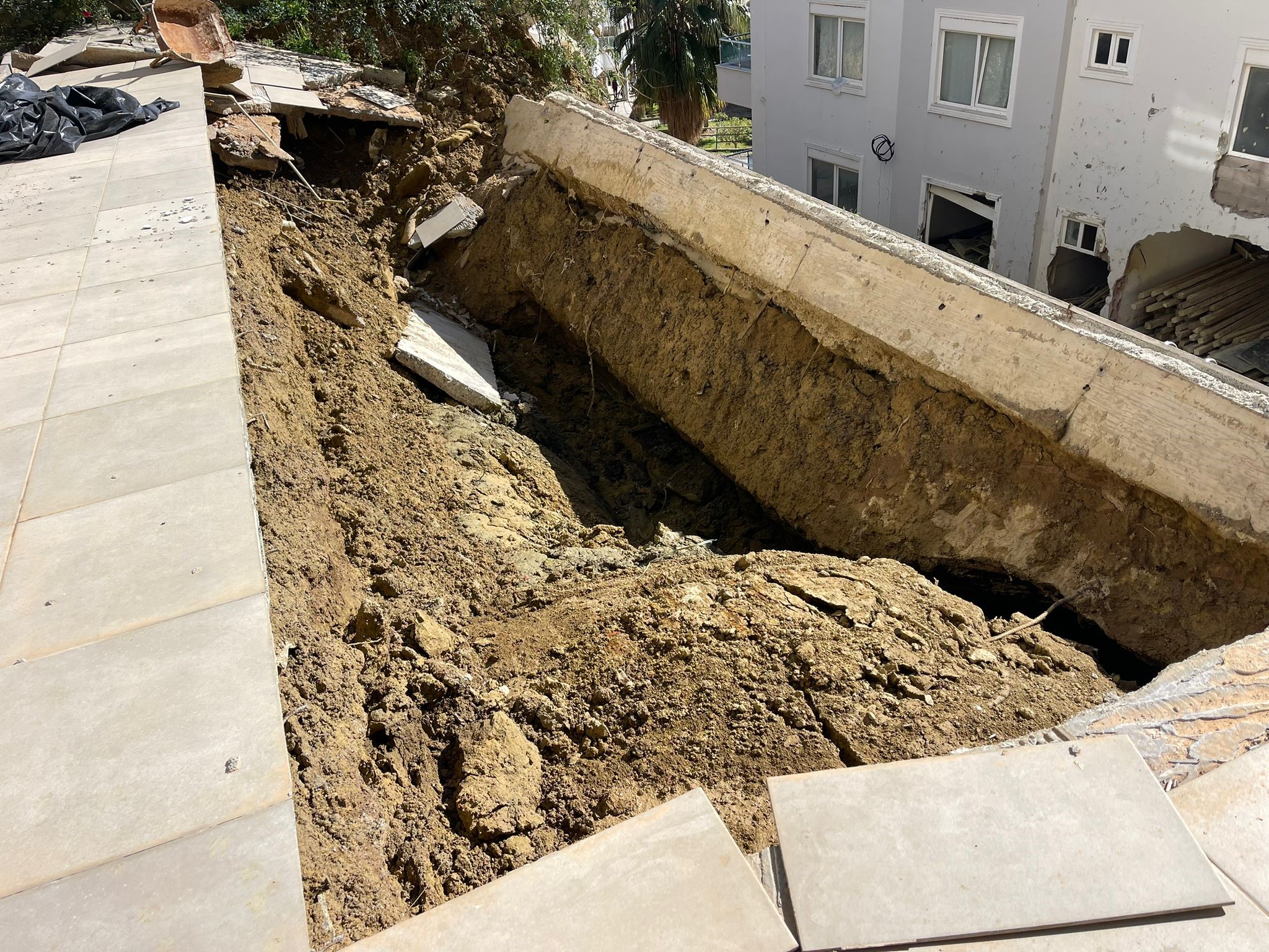 "İki gün önce yoğun yağıştan dolayı önce havuz göçtü, şimdi istinat duvarıyla birlikte komple aşağı indi. Bu binada 8 aile oturuyordu, hepsi tahliye edildi. Ben de evden eşyaları boşaltmaya geldim."