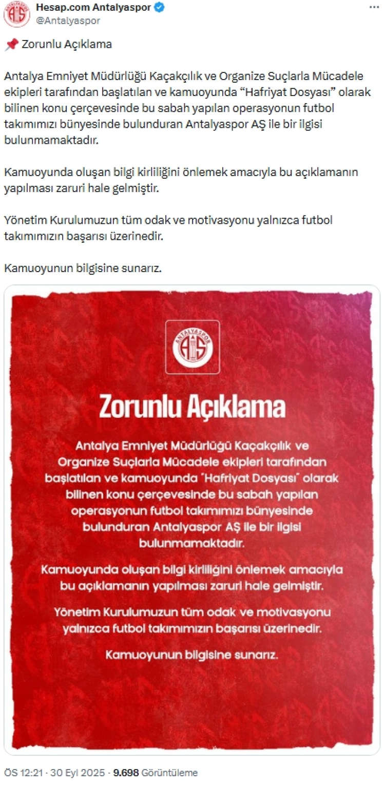 Açıklamada, bazı basın organlarında yer alan “Antalyaspor Derneği’ne operasyon, Antalyaspor’a gözaltı” başlıklarının gerçeği yansıtmadığı kaydedildi. Şu anki dernek ve anonim şirket yöneticileri hakkında soruşturma veya gözaltı kararı bulunmadığı özellikle vurgulandı. Kulüp, bu süreçte kendilerine destek olan taraftarlara teşekkür ederek, kamuoyunun yanlış bilgilendirilmemesi için duyuru yapma ihtiyacı doğduğunu bildirdi.