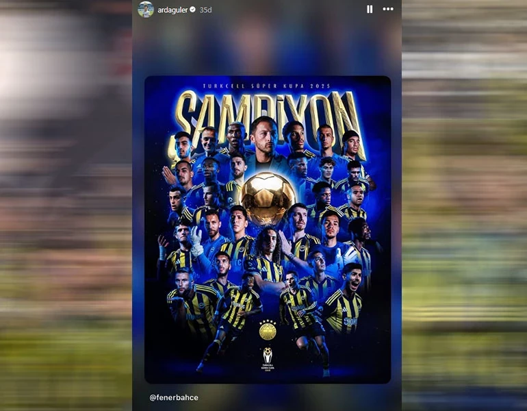 Real Madrid’de forma giyen milli futbolcumuz Arda Güler, eski takımı Fenerbahçe için sosyal medyadan özel bir paylaşım yaptı. Genç yıldız, Fenerbahçe’nin Süper Kupa’yı kazanmasının ardından, Sarı Lacivertli ekibin şampiyonluk kutlamalarını Instagram hikayesinde paylaşarak takipçileriyle duyurdu. Arda’nın bu jesti, hem eski kulübüne duyduğu bağlılığı hem de Sarı Lacivertli taraftarlara olan sevgisini bir kez daha ortaya koydu. Paylaşım, sosyal medyada kısa sürede büyük ilgi gördü ve taraftarlar, genç futbolcunun bu samimi mesajını coşkuyla karşıladı, yorum ve beğenilerle desteklerini gösterdi.