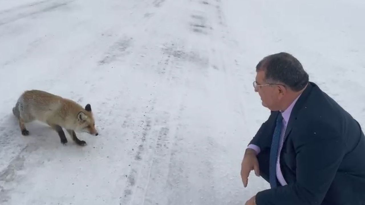 Aracını durduran Başkan Aydın, dondurucu soğukta yiyecek bulmakta zorlandığı tahmin edilen tilkinin yanına gitti. Normalde ürkekliğiyle bilinen ve insanlardan kaçan tilkinin, Başkan Aydın'dan kaçmaması ve sakin tavırları dikkat çekti.