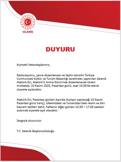 Türkiye'nin Selanik Başkonsolosluğunun sosyal medya hesabından yapmış olduğu açıklamada, Gazi Mustafa Kemal Atatürk'ün Selanik'te evinin 10 Kasım'da Atatürk'ü Anma Günü'nde düzenlenecek törene müteakip saat 10.00'da ziyarete açılacağı duyuruldu.