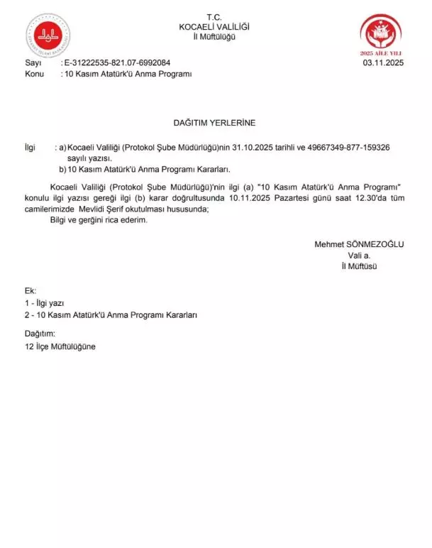 Kocaeli İl Müftüsü Mehmet Sönmezoğlu imzasıyla ilçe müftülüklerine gönderilen yazıda, 10 Kasım Pazartesi günü saat 12.30’da gerçekleştirilecek mevlit programının Atatürk, şehitler ve gaziler için okunacağı, etkinliğin Atatürk’ü Anma Günü kapsamında yapılacağı belirtildi.