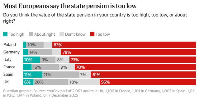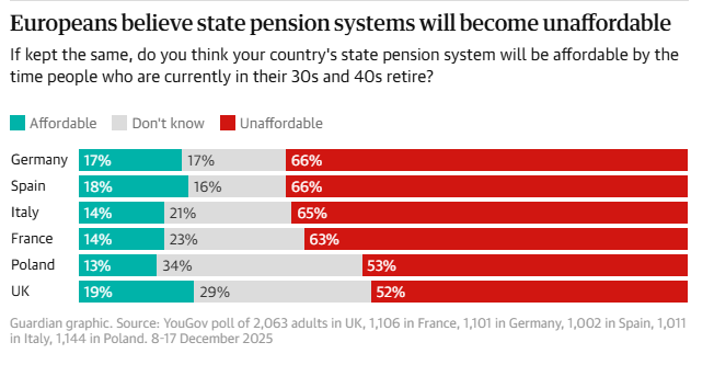 YouGov’un Fransa, Almanya, İspanya, İtalya, Polonya ve Birleşik Krallık’ta yaptığı ankete göre, devlet emeklilik planlarının hâlihazırda karşılanamaz olduğunu düşünenlerin oranı İtalya, Fransa, Almanya ve İspanya’da yüzde 52 ile 61 arasında değişiyor. Polonya’da bu oran yüzde 45, İngiltere’de ise yüzde 32 seviyesinde.