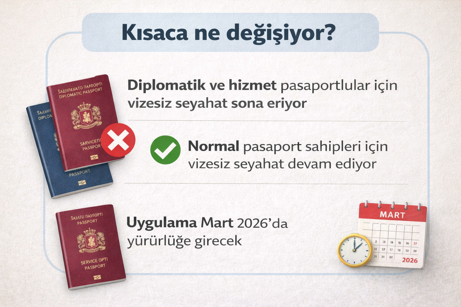 Kararın Mart 2026 itibarıyla uygulamaya alınmasının planlandığı belirtiliyor. Üye ülkeler açısından bağlayıcı olan düzenleme, diplomatik ve resmi pasaport sahiplerinin AB’ye girişinde yeni vize prosedürlerini beraberinde getirecek