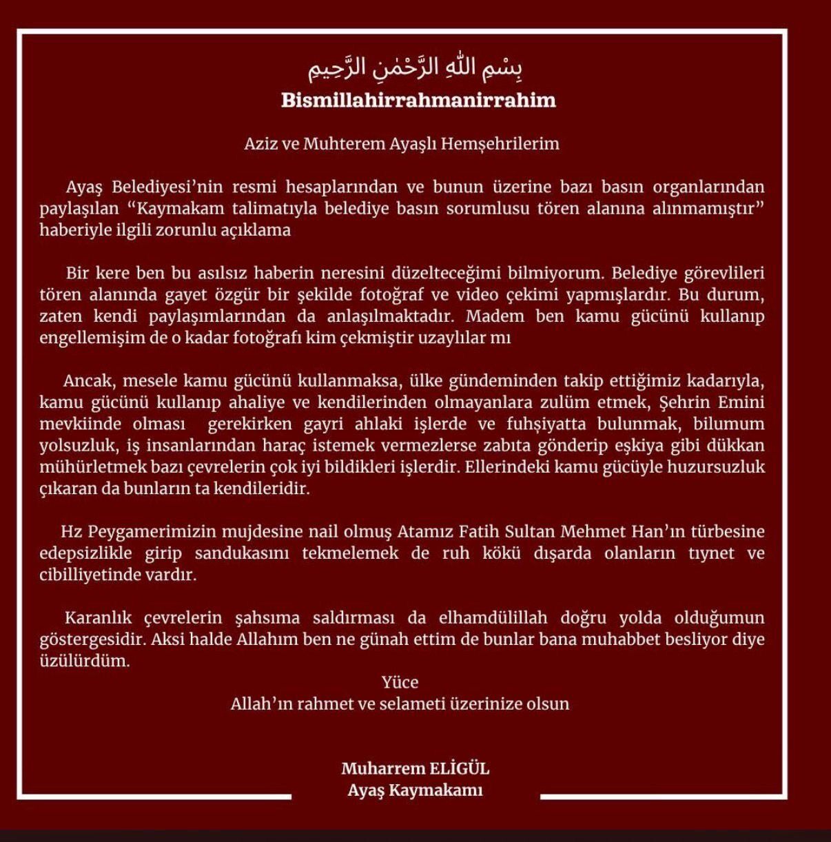 Ayaş Belediyesi'nin resmi hesaplarından ve bunun üzerine bazı basın organlarından paylaşılan "Kaymakam talimatıyla belediye basın sorumlusu tören alanına alınmamıştır" haberiyle ilgili zorunlu açıklama