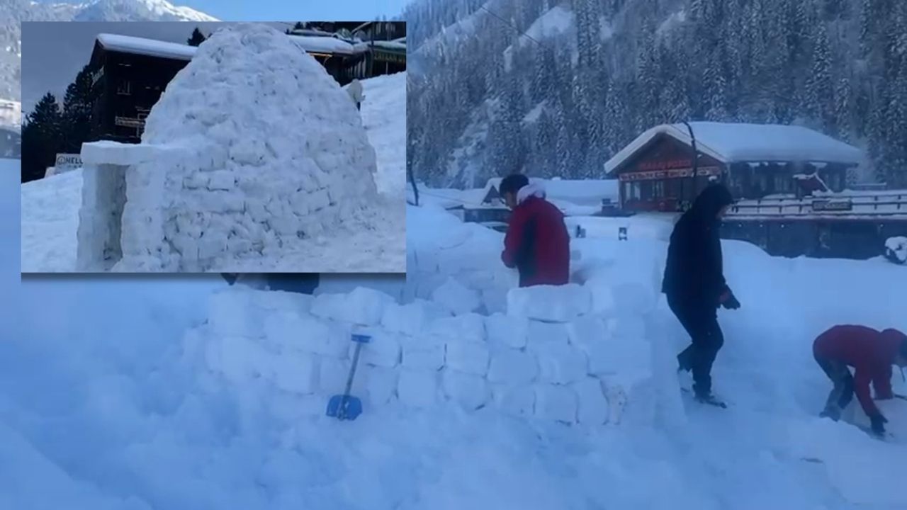 Yaklaşık 1 haftadır yağan ve zemine yerleşen kar kütleleri ağaç motoruyla kesilirken, kesilen donmuş kar kütleleri iglo yapımında kullanıldı.
