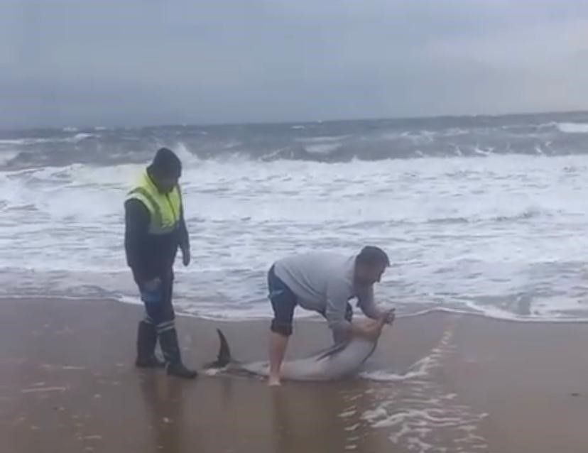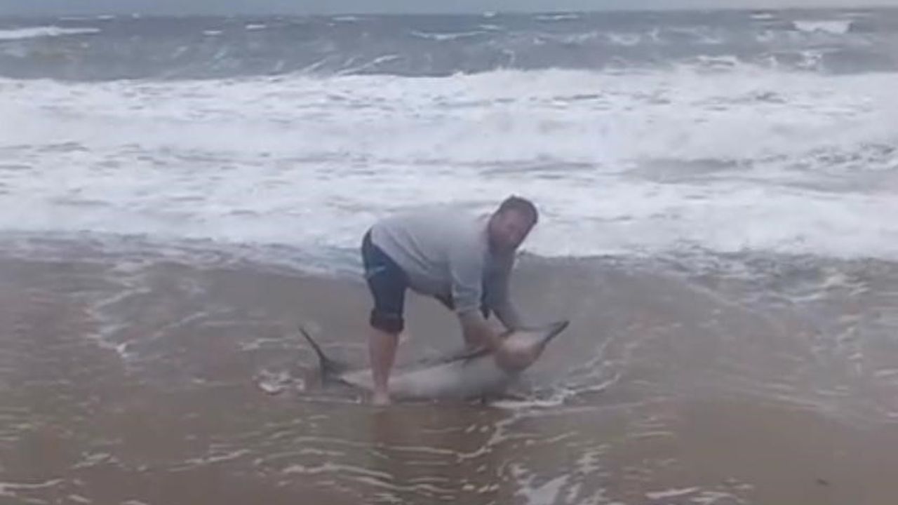 Belediye personeli Doğukan Akıncı, yunus balığına ulaşarak onu kucaklayıp yeniden denize göndermeyi başardı. Yaşanan olay vatandaşların yüreğini ısıttı.