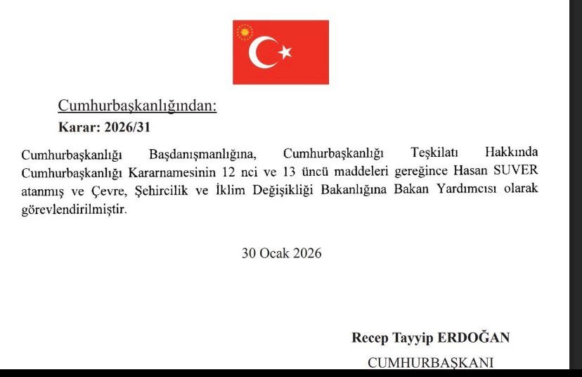 Resmî Gazete’nin 31 Ocak 2026 Cumartesi tarihli ve 33154 sayılı nüshasında yayımlanan “Atama Kararları” bölümünde yer alan düzenlemeye göre, Hasan Suver’in görevlendirilmesi Cumhurbaşkanlığı Kararı 2026/31 numarasıyla resmiyet kazandı.