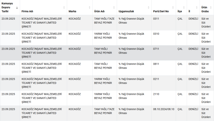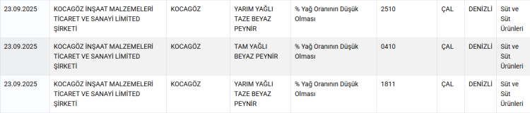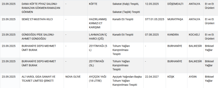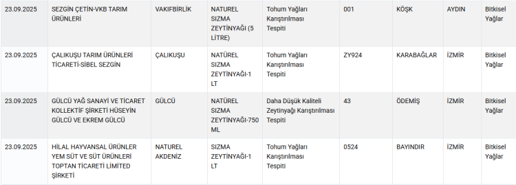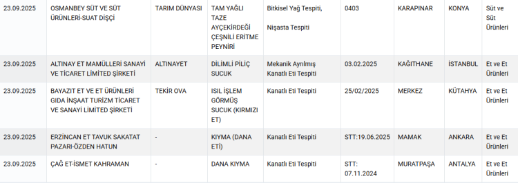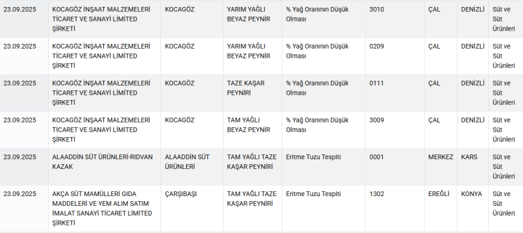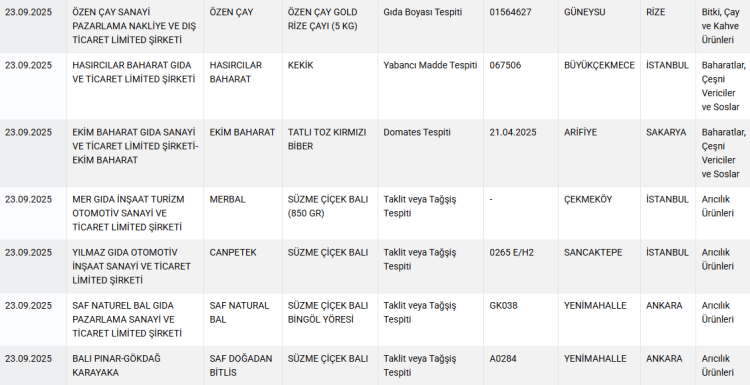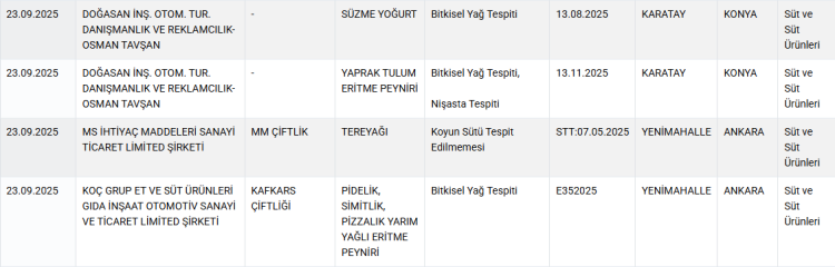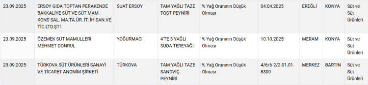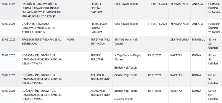 Yeni listede, Denizli, Kars ve Bartın illerinde faaliyet gösteren bazı firmaların ürünlerinde tağşiş tespit edildi.