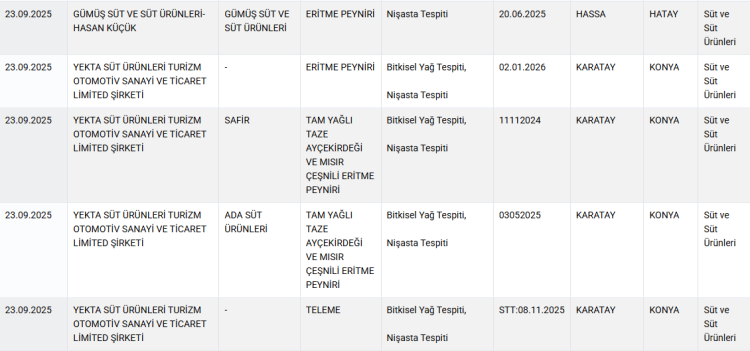 Son güncellenen ifşa listesinde, beyaz peynirde yapılan hileler dikkat çekerken, bal, kekik, tereyağı ve zeytinyağı gibi çok sayıda üründe hile ortaya çıktı.