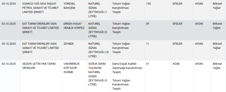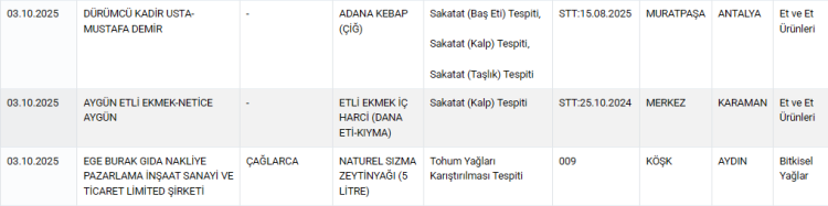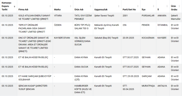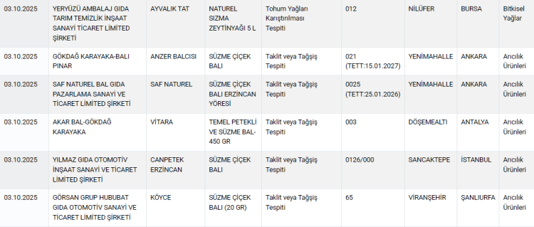 Bakanlığın yayımladığı son listede, et ürünlerinden süt ürünlerine, zeytinyağından bala kadar birçok kategoride yapılan analizlerde ciddi usulsüzlüklere rastlandı.