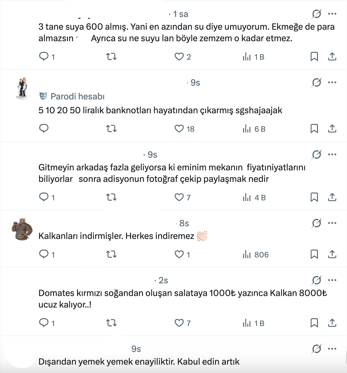 - Su, Ekmek ve Mısır Ekmeği: 600 TL