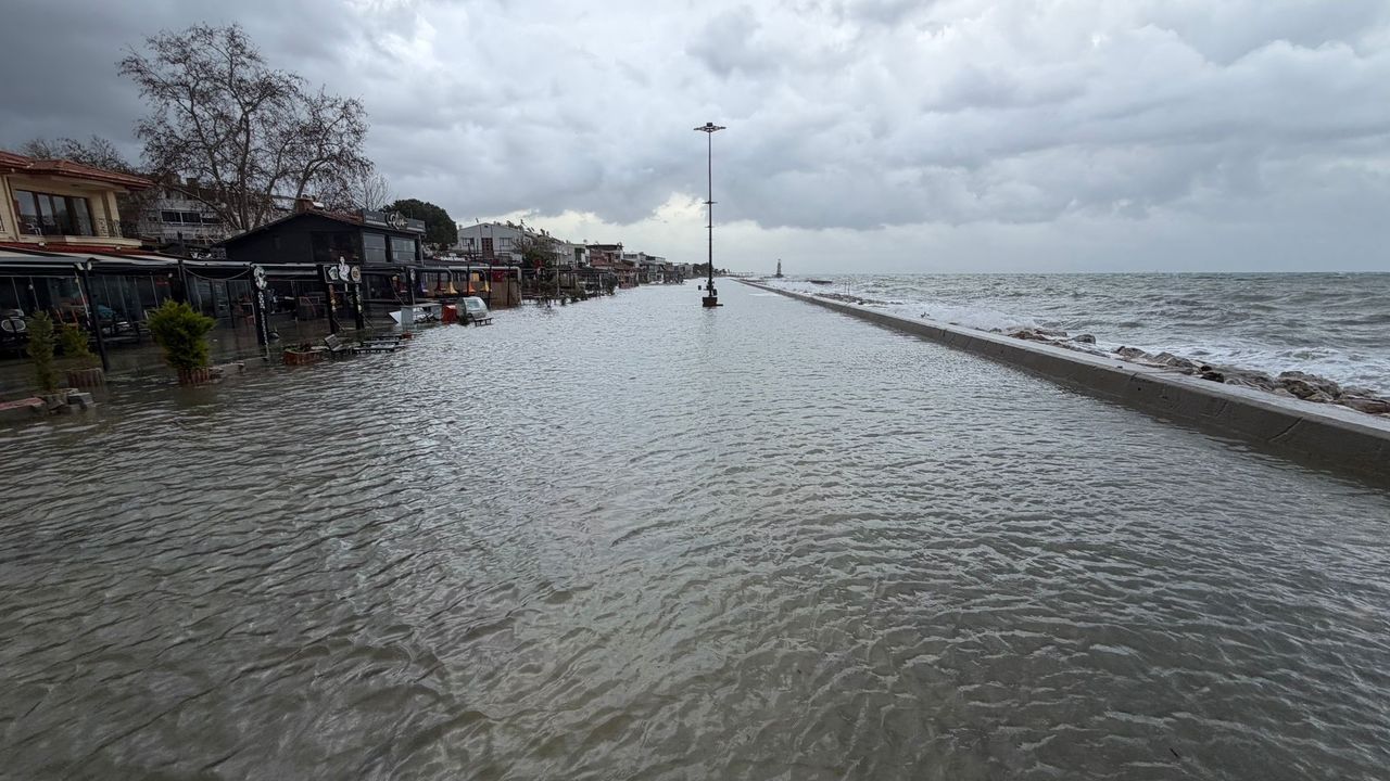 Denizin taşması sonucu kordon boyunda bulunan yürüyüş yolları ve çok sayıda turistik işletme sular altında kaldı.