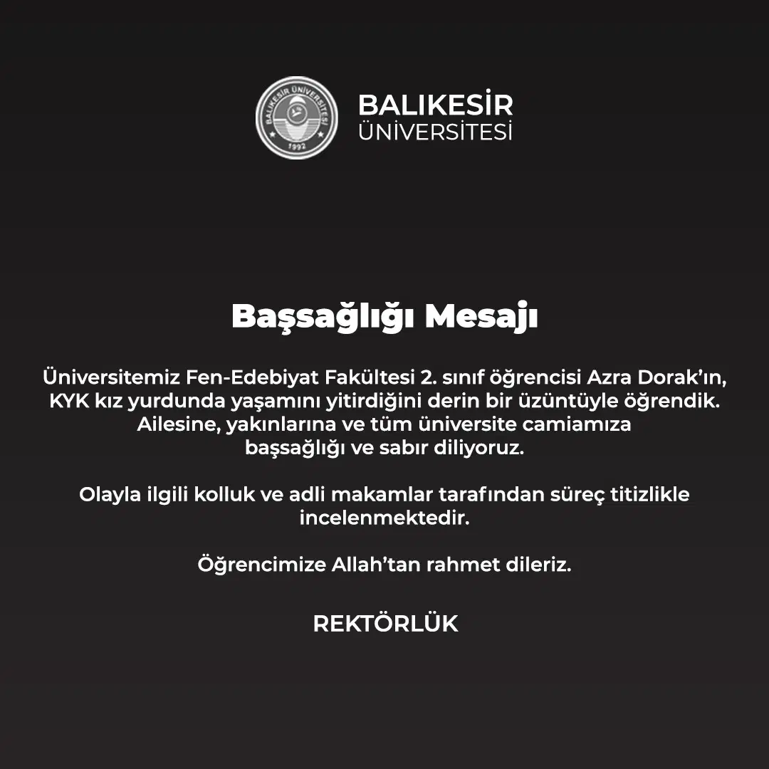 Rektörlük tarafından üniversitenin Fen-Edebiyat Fakültesi'nde okuyan 2. sınıf öğrencisi Azra Dorak olarak açıklanan öğrencinin yurt binasının 3. katındaki balkondan aşağı düştüğü öğrenildi.
