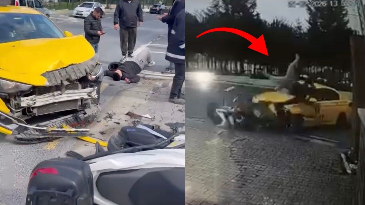 Görüntülerde motosikletin cadde üzerinde ilerlediği, taksinin dönüş yaptığı sırada iki aracın çarpıştığı ve sürücünün savrulduğu anlar yer aldı.