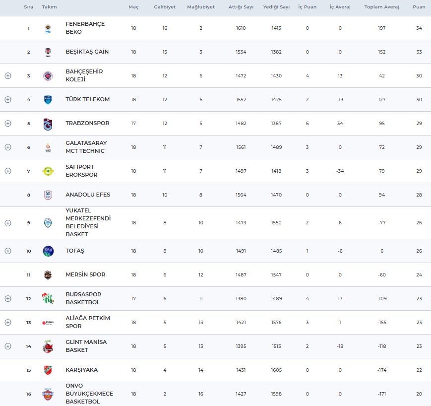 Türkiye Sigorta Basketbol Süper Lig'de Fenerbahçe Beko 34 puanla liderliğini sürdürüyor. Beşiktaş Gain'in, Onvo Büyükçekmece Basketbol'u 62-79 mağlup ederek zirve takibini sürdürdüğü haftada oluşan puan durumu şu şekilde :