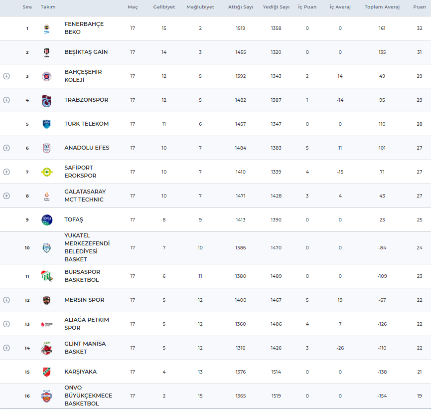 Türkiye Sigorta Basketbol Süper Lig'de Fenerbahçe Beko en yakın rakibi Beşiktaş Gain'in 1 puan önünde 32 puan ile liderliğini sürdürüyor. 18. hafta oynanacak maçlardan önce oluşan puan durumu şu şekilde:
