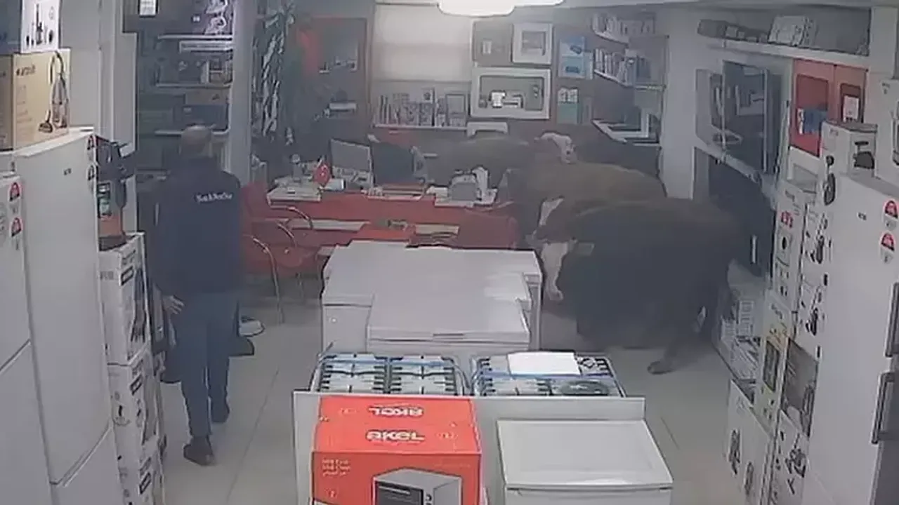 Görüntülerde, art arda koşturan ineklerin iş yerine girdiği, iş yerinin içinde gezinen inekleri gören esnafın dışarı çıkartmaya çalışması sonucu bazı eşyaların devrildiği ve ineklerin bir süre sonra iş yerinden çıktıkları yer alıyor.