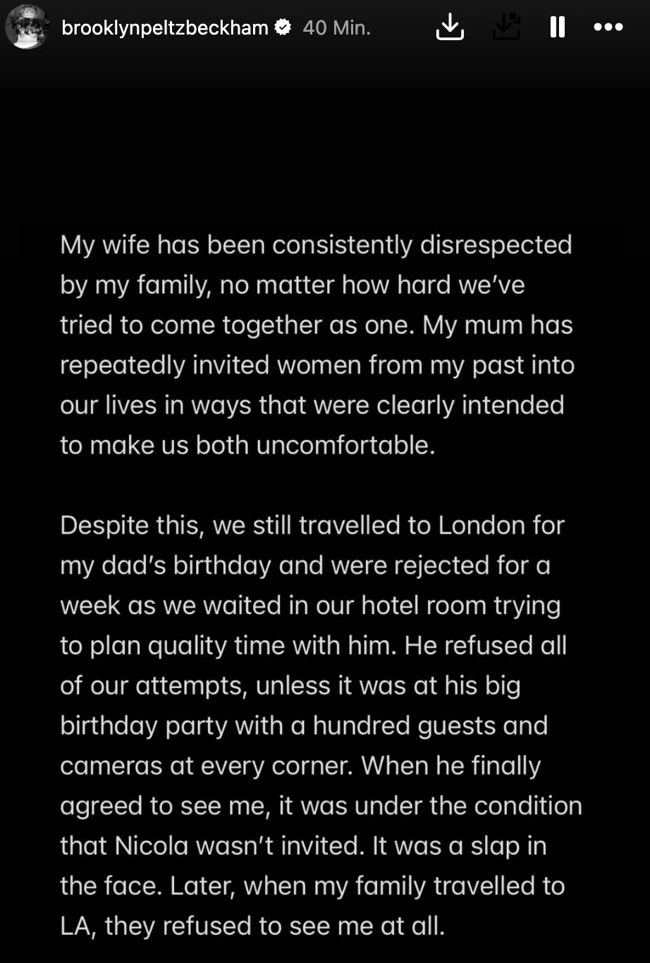 Brooklyn, ailesinin Nicola ile ilişkisini olumsuz etkilemeye çalıştığını öne sürüyor. Düğün hazırlıkları sırasında Victoria Beckham’ın son anda gelinliği tasarlamayı reddettiğini, ilk dans için kendilerini evli bir çift olarak sahneye çıkarmaktan alıkoyduğunu belirtti. Brooklyn, Instagram’da “Kendimi hiç bu kadar aşağılanmış hissetmemiştim” ifadelerini kullandı.