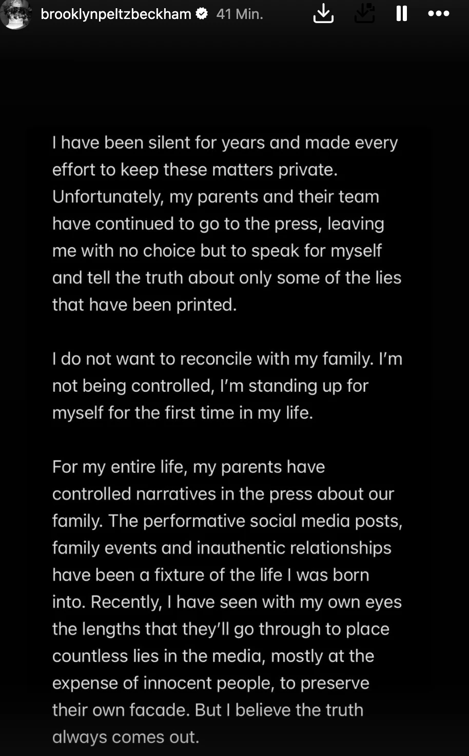 Brooklyn, ebeveynlerinin hayatındaki her şeyi kontrol ettiğini ve sosyal medyada sahnelenmiş paylaşımlar yaptığını iddia ediyor. “Tüm hayatım boyunca, ailemizin basında nasıl gösterileceğini ebeveynlerim kontrol etti. Sahnelenmiş sosyal medya paylaşımları, aile toplantıları ve sahte ilişkiler hayatımın sürekli bir parçası oldu” dedi.