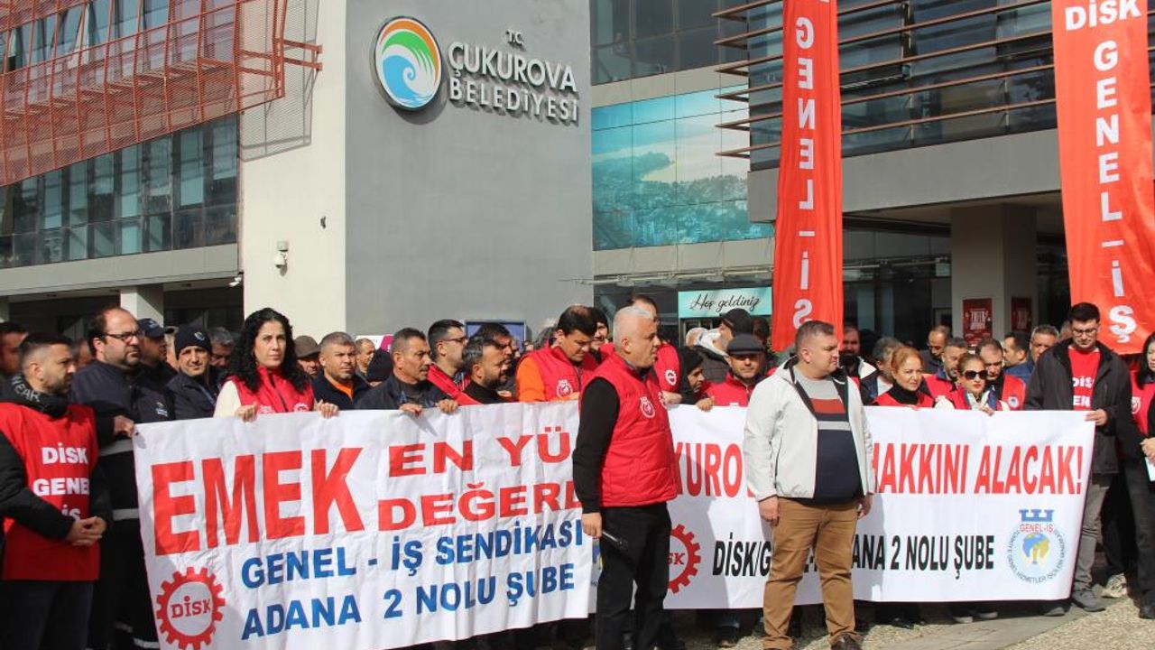Adana’da Çukurova Belediyesi’nde çalışan sendika üyesi işçiler, aylardır ödenmeyen alacakları ve tıkanan toplu iş sözleşmesi görüşmeleri nedeniyle belediye binası önünde eylem yaptı. Yaklaşık 150 işçinin katıldığı protestoda, işçiler belediye yönetimine tepkilerini dile getirdi.