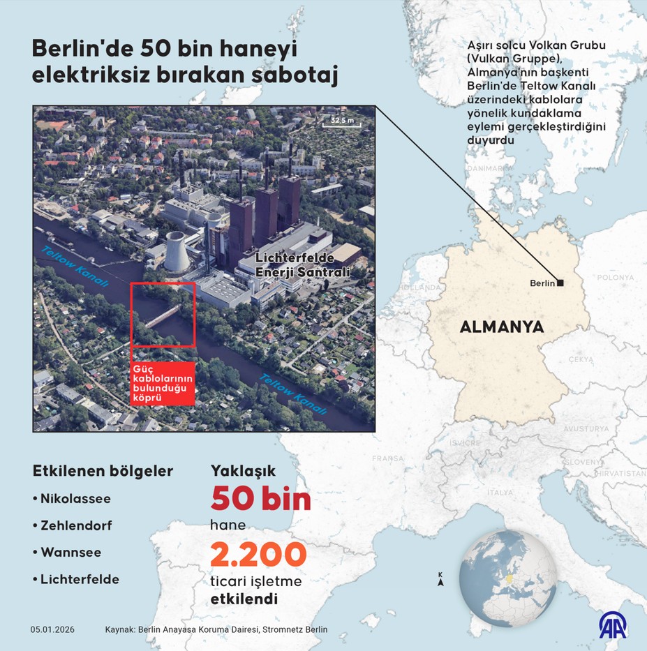 Lichterfelde elektrik ana istasyonunda çıkan yangınla başlayan krizin arkasında bir sabotaj olduğu kesinleşti. Federal Savcılık, eylemi üstlenen aşırı solcu "Volkan Grubu"na yönelik terör soruşturmasını derinleştirdi. Şüpheliler; anayasaya aykırı sabotaj, terör örgütü üyeliği ve kundaklama gibi ağır suçlarla yargılanacak. Olay yerindeki incelemeler ve görgü tanıklarının ifadeleriyle hazırlanan iddianamenin kısa süre içinde mahkemeye sunulması bekleniyor.