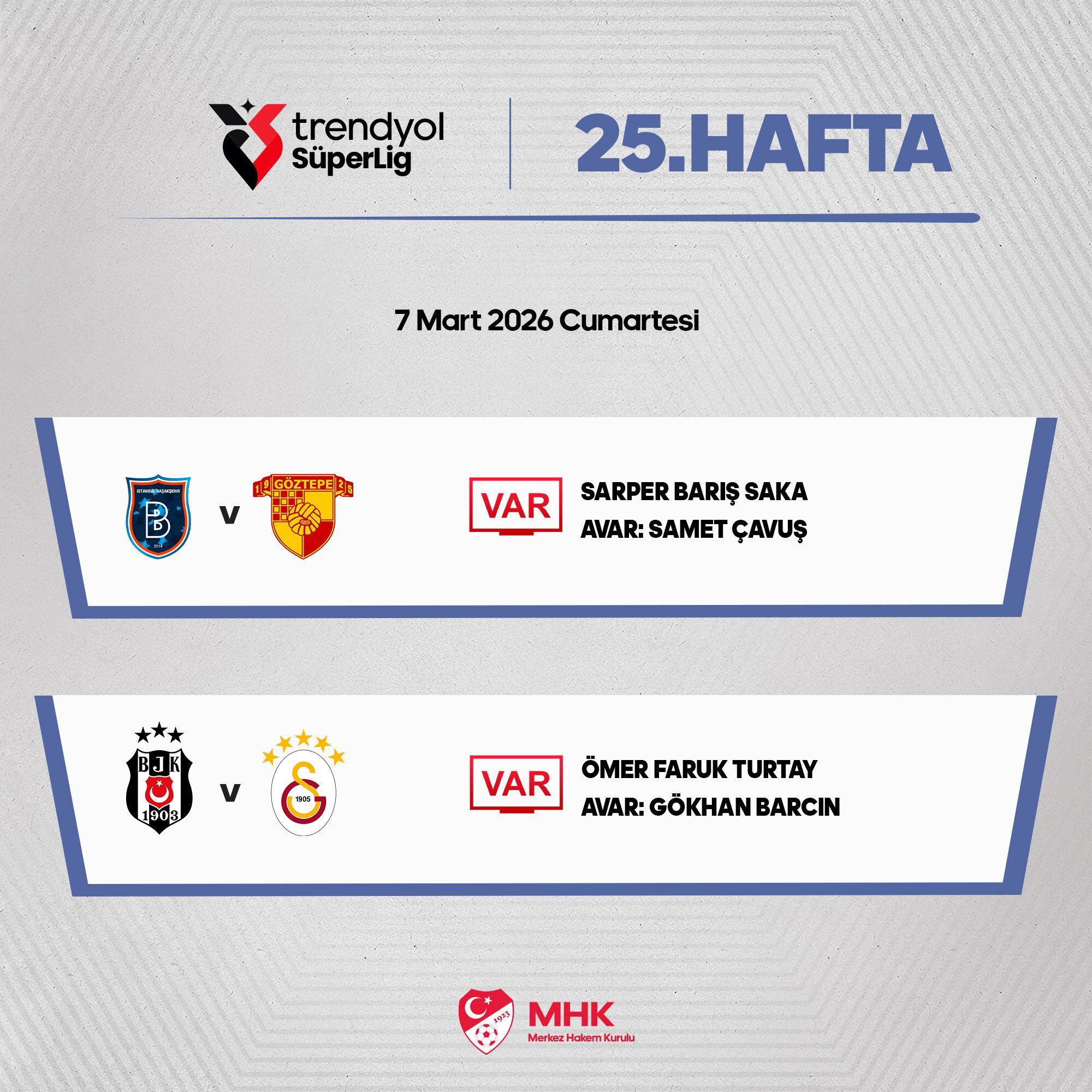 Süper Lig'in 25. haftasında bu akşam oynanacak olan Beşiktaş - Galatasaray derbisinin VAR hakemi Ömer Faruk Turtay oldu.