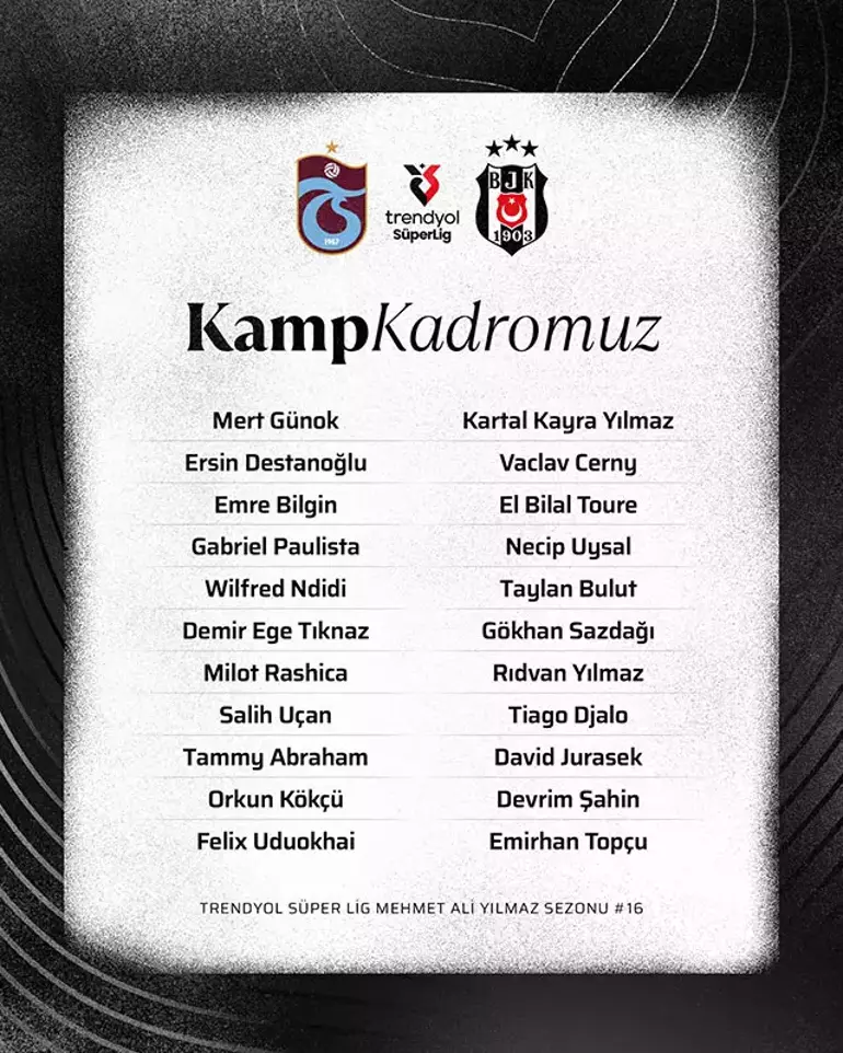 Süper Lig’de deplasmanda Trabzonspor ile karşılaşacak Beşiktaş’ın kamp kadrosu açıklandı. Teknik heyet, kritik mücadele öncesi kadroya dahil edilen oyuncularla hazırlıklarını tamamlamak üzere çalışmalarını sürdürüyor. Kadroda yer alan ve yer almayan isimler taraftarın dikkatini çekerken, Siyah Beyazlı ekip, eksik veya sakat oyuncularına rağmen sahadan galibiyetle ayrılmayı hedefliyor.