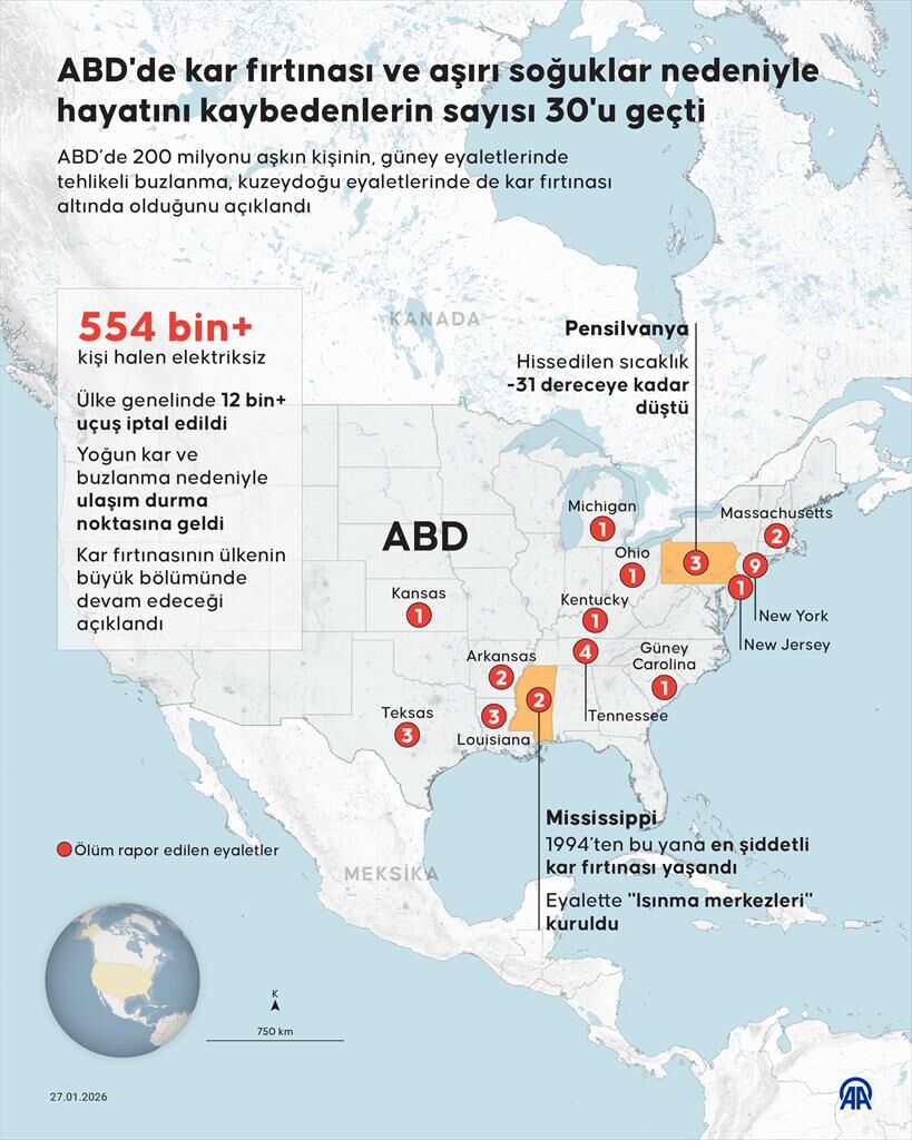 Hava durumu servisleri, Pensilvanya’nın kuzeyinde kar kalınlığının yer yer 50 santimetreyi aştığını, hissedilen sıcaklığın ise eksi 31 dereceye kadar gerilediğini açıkladı. Mississippi eyaletinde ise 1994’ten bu yana görülen en şiddetli fırtına sonrası ev ve iş yerleri büyük hasar gördü. Eyalet genelinde hayatta kalma mücadelesi veren vatandaşlar için acil "ısınma merkezleri" kuruldu.