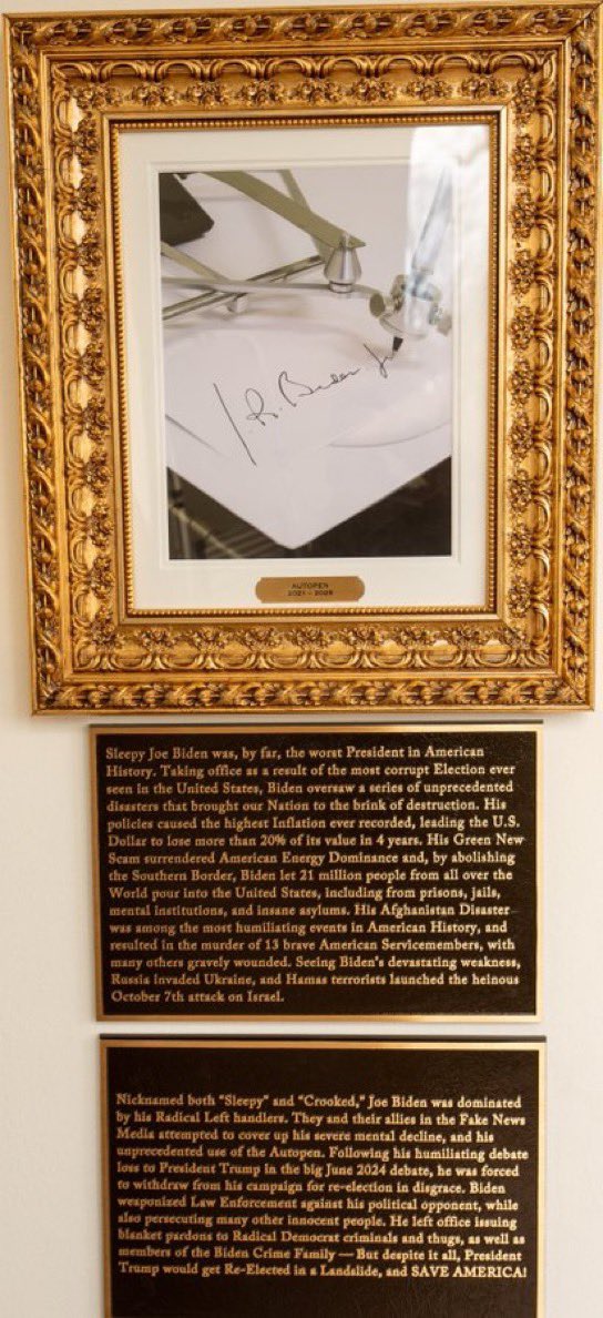 Joe Biden’ın tasvirinde yüzü gösterilmiyor; yerine yasaları ve kararnameleri imzaladığı varsayılan bir makine resmi yer alıyor. Plakette şu ifadeler öne çıkıyor: