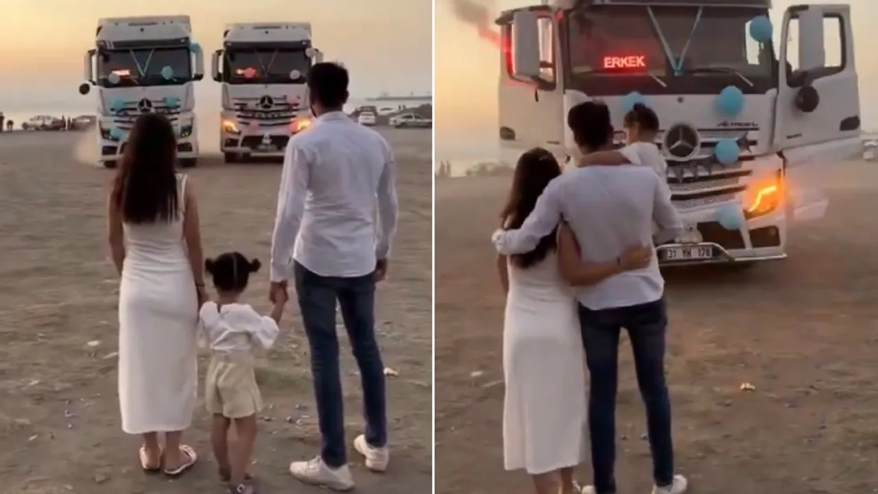 Paylaşılan videoda mavi ve pembe balonlarla süslenmiş 2 TIR aynı anda yola çıkıyor ve çifte doğru geliyor. Mavi balonlu, üzerinde erkek yazan TIR diğerini geçerek çiftin önünde duruyor ve bebeğin cinsiyetini haber veriyor.